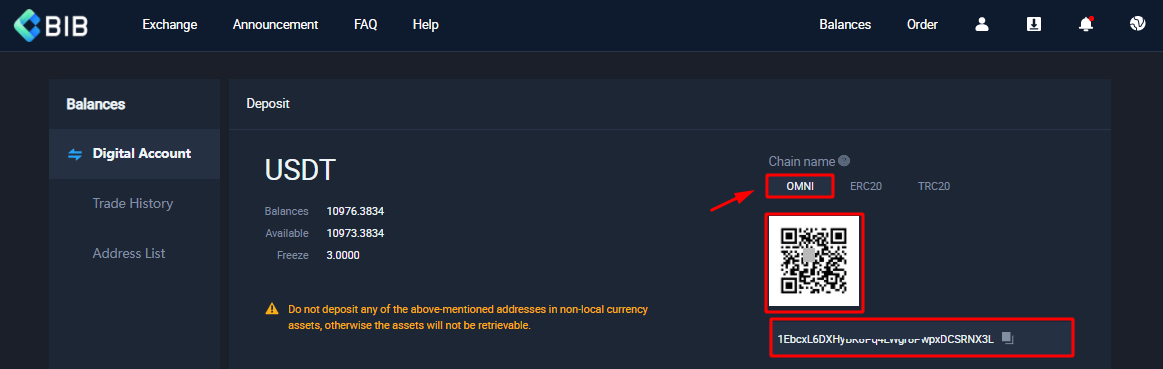 The first type: USDT-Omni is the USDT issued by Tether based on the BTC network, and the deposit and withdrawal of coins are through the BTC network. The protocol used by USDT-Omni is the omni layer protocol built on the BTC blockchain network. Due to a number of reasons related to trading experience, BIB does not support Omni at the moment.