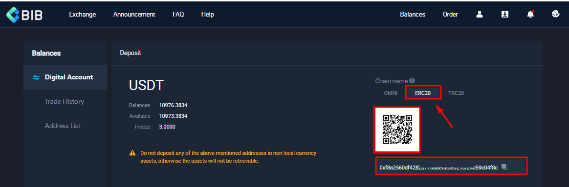 The second type: USDT-ERC20 is the USDT issued by Tether based on the ETH network, and the deposit and withdrawal of the currency are through the ETH network. USDT-ERC20 uses the ERC20 protocol. (Your ETH deposit address in BIB is the same as the ERC20-USDT deposit address)