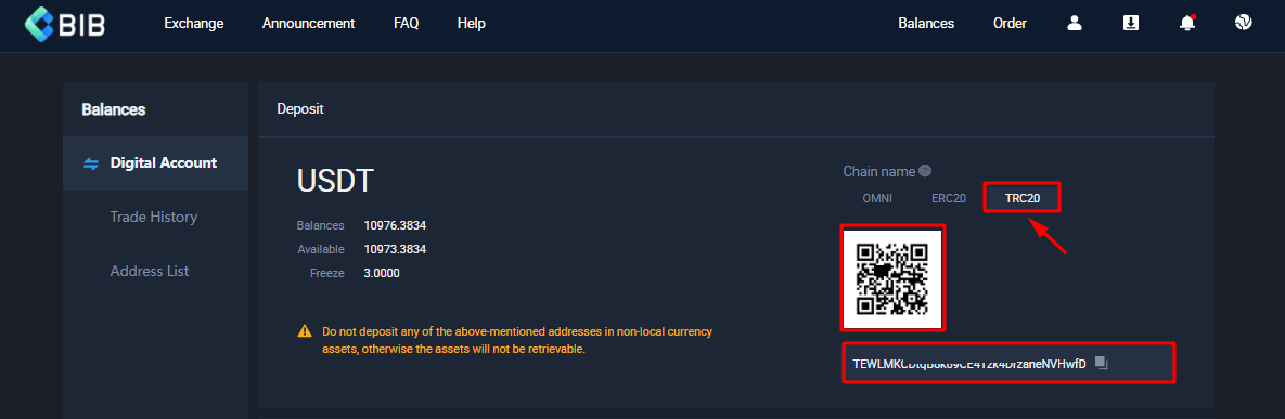 The third type: USDT-TRC20 (USDT-TRON) is the USDT issued by Tether based on the TRON network, and the deposit and withdrawal of coins are made through the TRON network. USDT-TRC20 (USDT-TRON) uses the TRC20 protocol (Your TRX deposit address in BIB is the same as the TRC20-USDT deposit address).