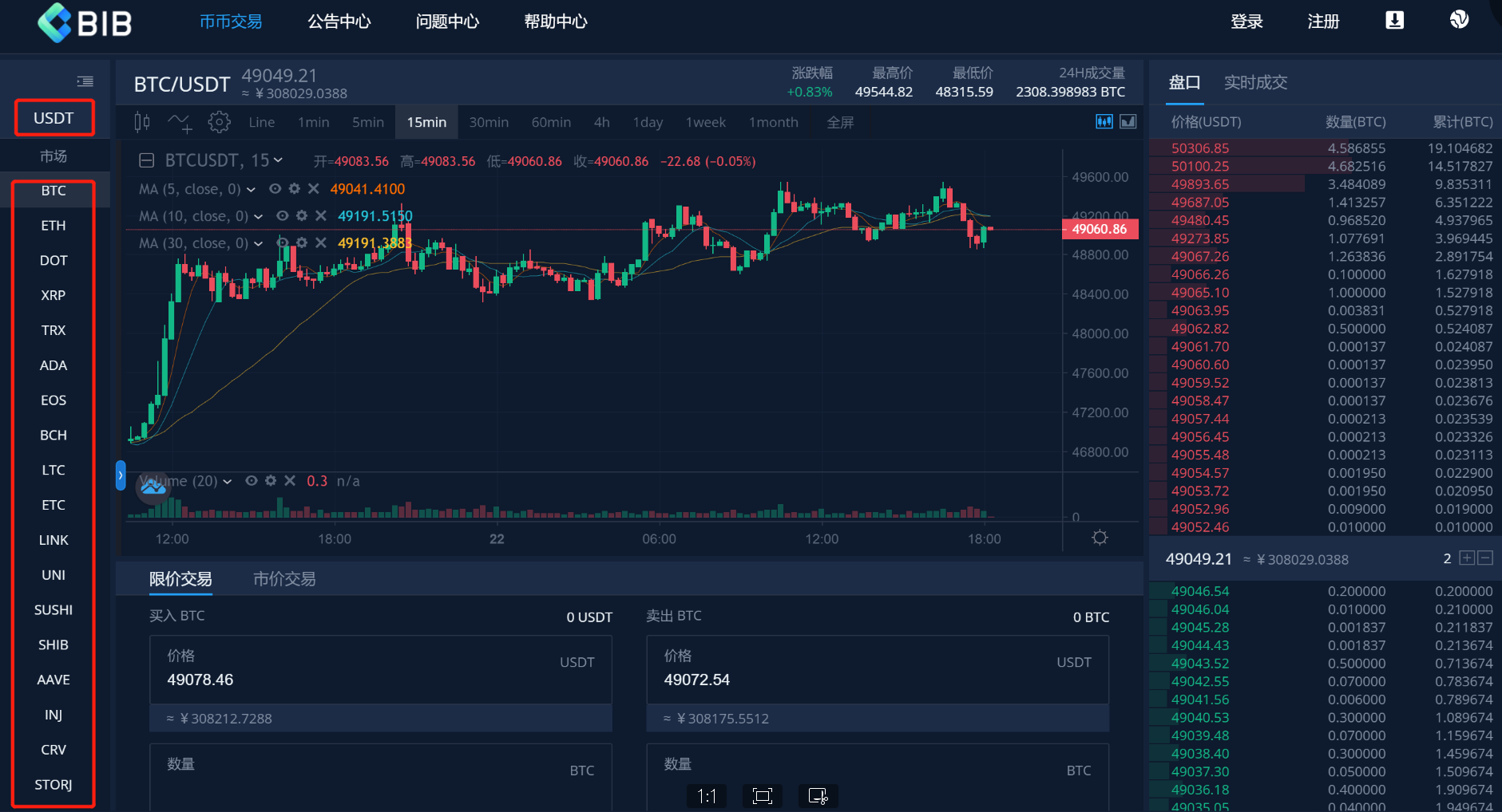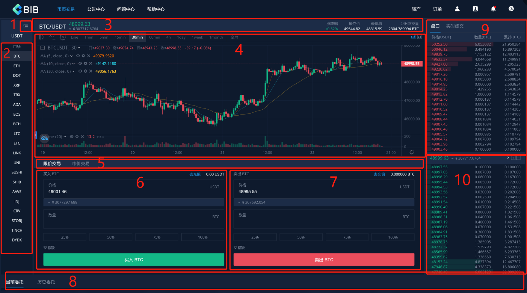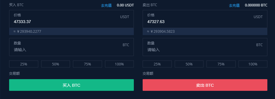 进入交易中心的下单区域,参考左侧的买卖区价格,输入合适的BTC购买价,输入数量,点击买入BTC,完成购买。(卖单同理)
