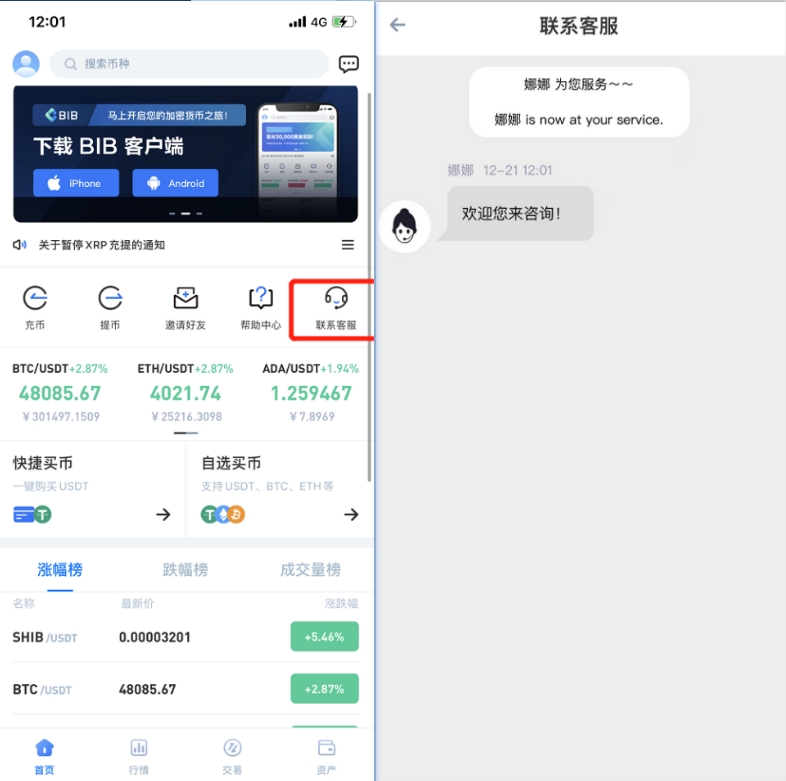 打开BIB APP,在首页Banner右上方找到客服耳机图标,点击进入对话页。