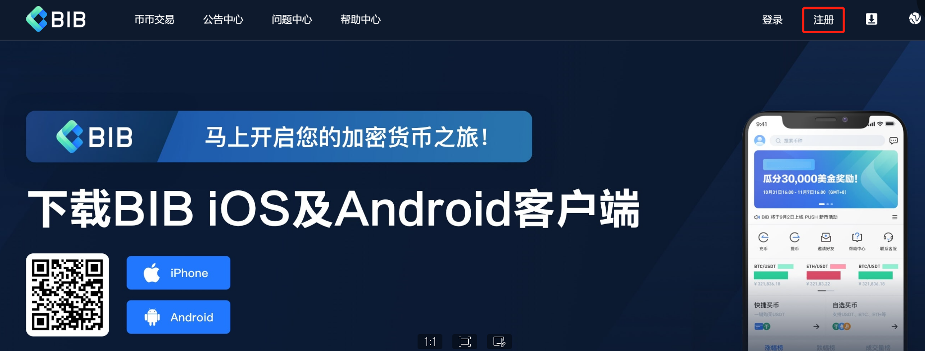 1. 进入BIB官网,点击右上角【注册】按钮。