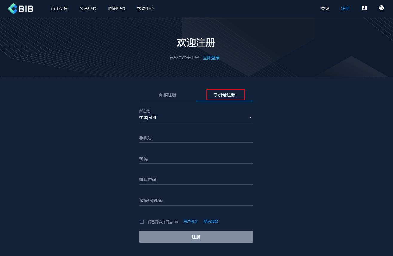 3. 填写相关信息如手机号、密码及邀请码(若获朋友邀请)后确保已阅读并同意BIB用户协议和隐私条款。